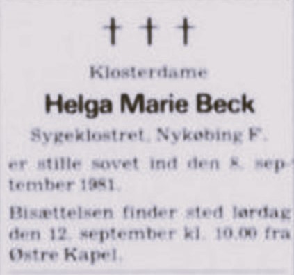 8. september 1981 Helga Marie (89 år) døde på Sygeklosteret i Nykøbing Falster. 12. september 1981 blev hun bisat fra Østre Kapel