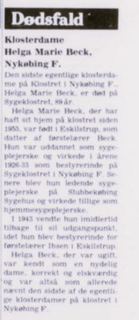 1955 – 1981 var Helga Marie selv ”Klosterdame” på Klosteret i Nykøbing Falster