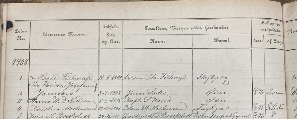 Idas værge var bolsmand Jens Saks, gift med Johanne Kirstine Sørensen. Fløibjerg 48, Ødis. En bolsmand er en gårdejer med min. 15 tdr. land.