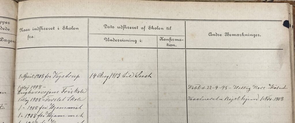 Som 13-årig kom Ida i familiepleje på en stor gård i Ødis i Sønderjylland, hvor hun boede i 2 år. Hun gik i skole, men har selvfølgelig samtidig arbejdet på gården. Engang fortalte mormor mig, at hun havde malket køer, da hun var barn, og det har jo været der på gården. Man kan finde hende i skoleprotokoller på begge skoler. I Ødis blev hun indskrevet i 5. klasse i april måned, og det nye skoleår startede 1. maj. Altså gik hun et år om ved skoleskift.