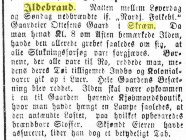 21. februar 1881 skete der en stor ulykke. Både købmandsbutikken og gården i Skræm brændte ned midt om natten. Der gik ild i købmandsbutikken pga. en petroleumslampe, som hang for tæt ved loftet. Hele gårdens besætning blev reddet, men alt indbo brændte, og familien havde kun det tøj, de stod i. Gårdejeren, Otzen, havde en alt for lille forsikring. Og i 1882 gik Godtborg Johan konkurs med gården.