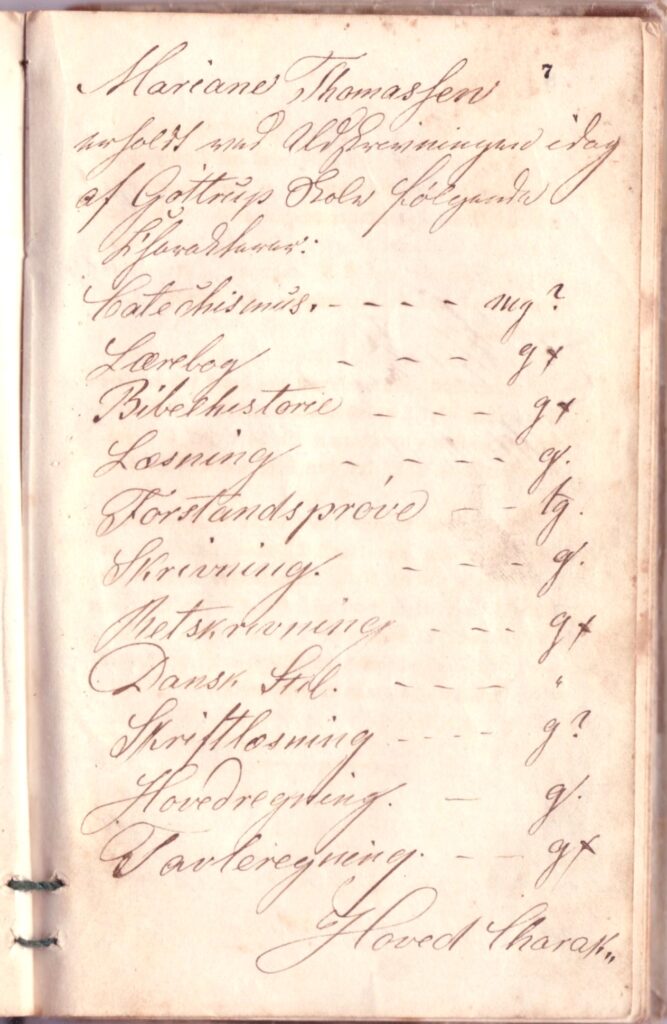 Karakteren g / godt betød på det tidspunkt, at standpunktet var godt nok, altså middel. I forstandsprøven fik Mariane tg, som betød temmelig godt, altså lidt under middel … Men hun fik mg i flid, hvilket er “meget godt”. Men hvad der derefter stod i hendes skudsmålsbog, ved vi ikke, for Mariane har klippet nogle sider ud!
